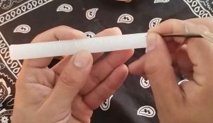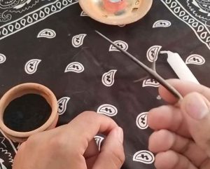 con esto listo juntaras en un recipiente un poco de carbón en polvo y en otro pequeño un poco de tu saliva, vas a mojar la punta de la espina en la saliva y luego tocaras en el carbón como si fuera una pluma. Toma así la espina y haz un corte de un lado hacia el otro de la vela sin romperla