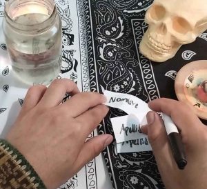 A continuación vas a tomar los tres papeles y escribirás tu nombre completo y apellido en todos los papeles, en la cara trasera escribirás la palabra brujería. De modo que en una cara del papel dice tu nombre y en la otra la palabra brujería.