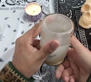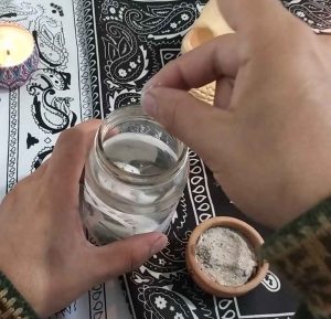 Para esto necesitaras los siguientes ingredientes y materiales: un frasco de vidrio con tapa, un poco de sal fina, un poco de ceniza de maderas, un vaso con agua, una vela blanca, papel, lapicero y una imagen de la santa muerte.